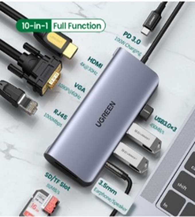 - Cáp chuyển đa năng USB-C 10 in 1 cao cấp Ugreen 80133 được sản xuất bởi thương hiệu quốc tế Ugreen với thiết kế nhỏ gọn tinh tế, chất liệu cao cấp bao gồm vỏ nhôm sang trọng, lõi cáp bằng đồng nguyên chất và các chipset xử lý cao cấp, mang đến độ bền vượt trội và khả năng kết nối tối ưu nhất. Ngoài ra, nhà sản xuất còn trang bị thêm cổng USB-C giúp kết nối sạc cho máy tính, laptop của bạn ngay khi đang xử dụng thiết bị này.